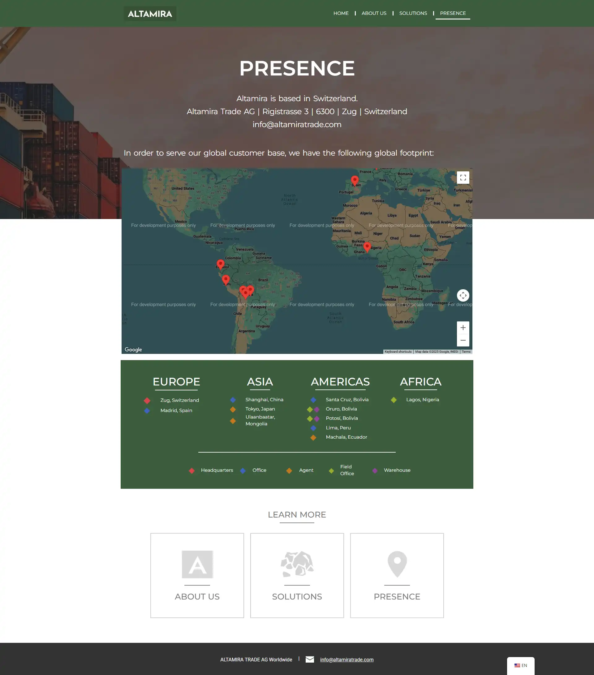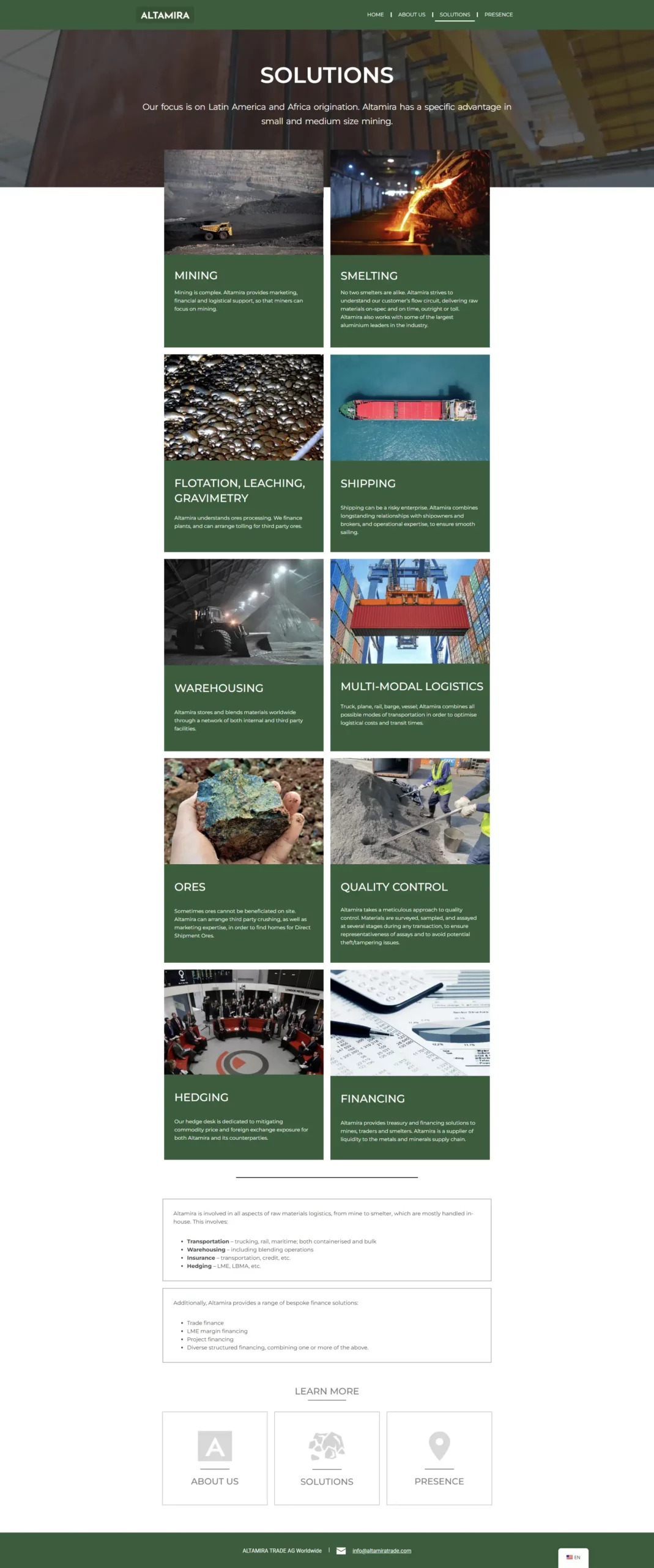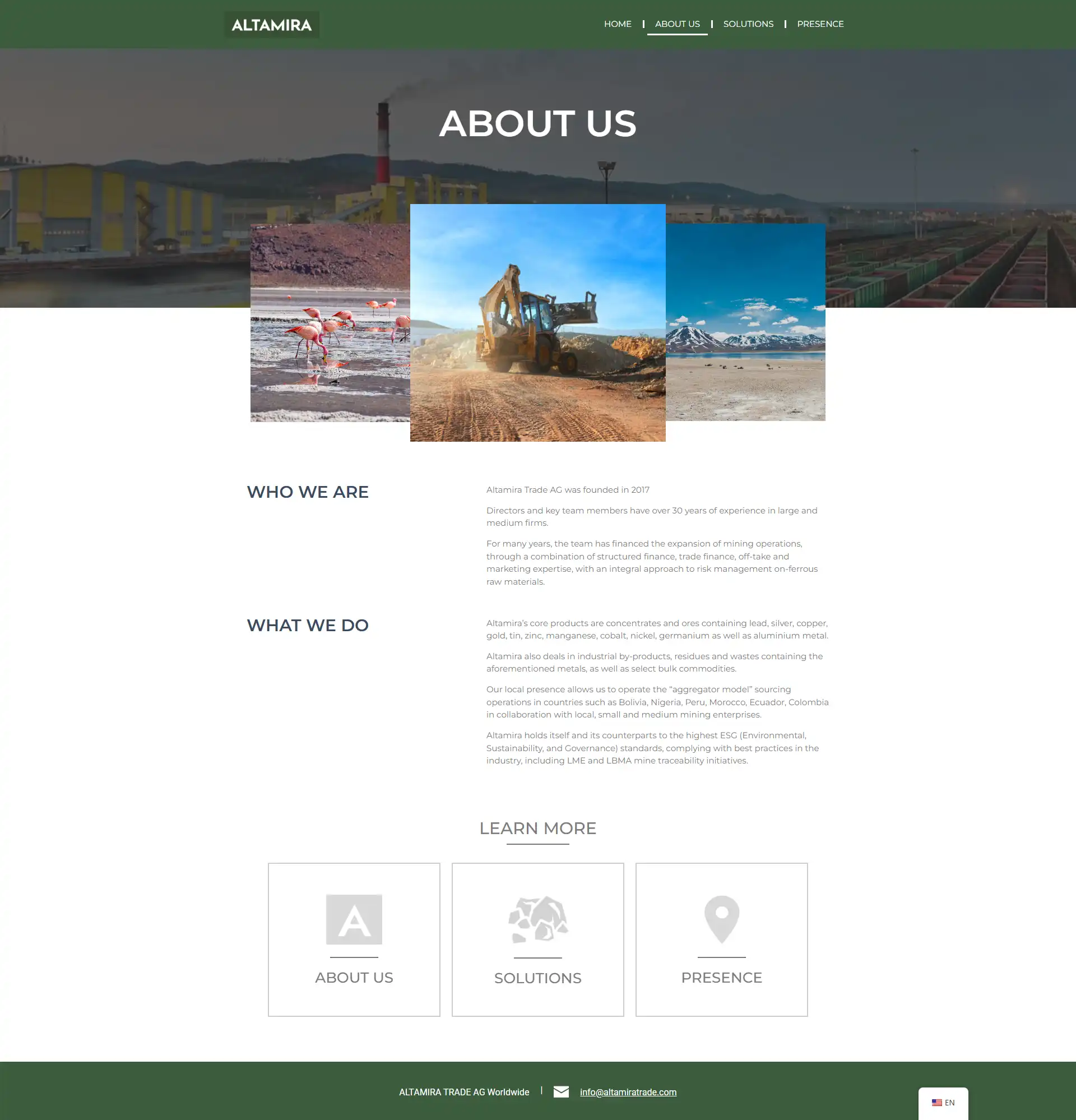The Altamira Trade website was developed following the client’s original design, replicated precisely across English, Spanish, and Chinese versions. Its structured layout and professional tone highlight the brand’s international scope in commodities, trading, and finance.